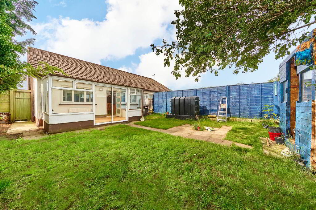 Outside The front garden is walled in and laid out in lawn with driveway for parking . Side access to rear garden which is fenced in and also laid in lawn with wooden garden shed.
