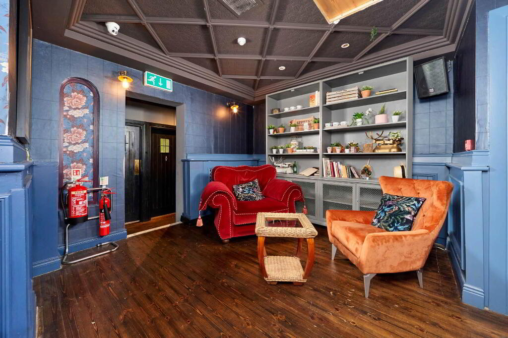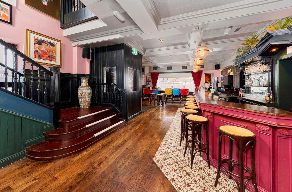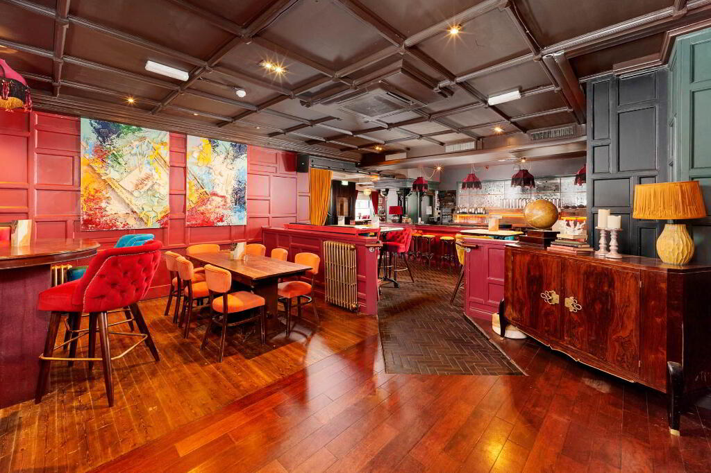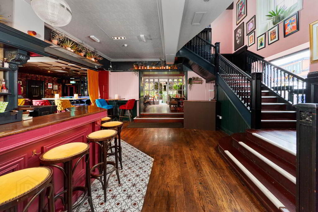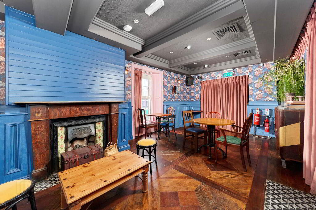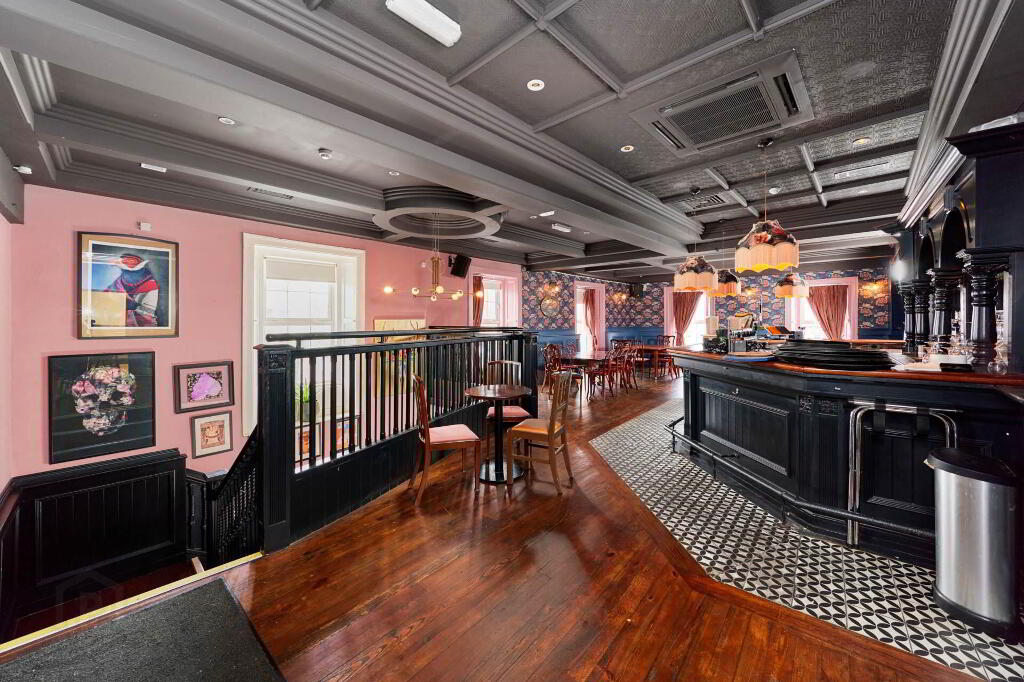 The first floor offers a stylish and inviting bar and lounge area, finished with rich wooden floors, elegant panelling, and vintage style decor. The spacious bar counter is centrally positioned, surrounded by ample seating with a mix of traditional tables, chairs, and cosy nooks, ideal for dining, casual drinks and private functions. Decorative lighting, patterned wallpaper, and feature fireplaces add warmth and character, creating a vibrant yet comfortable atmosphere. This level also benefits from customer bathrooms finished to a high standard. The first floor is also complete with a fully equipped, stainless-steel commercial kitchen with full catering fit-out, adjoining prep and storage areas, ideal for high volume service. This is a turnkey commercial kitchen is perfectly set-up support a busy food and beverage operation.